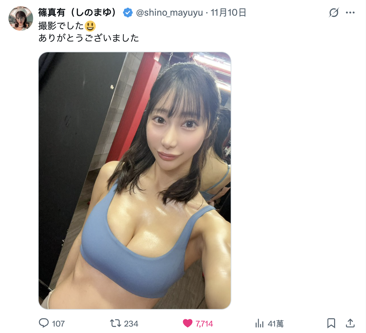 然後,她最近又開始更新社群(https://x.com/shino_mayuyu),也在10日的時候告訴大家「拍完片子了」,再加上週五(11/21)要辦活動,生涯應該是穩定的,就看看Moodyz什麼時候要中出她吧〜