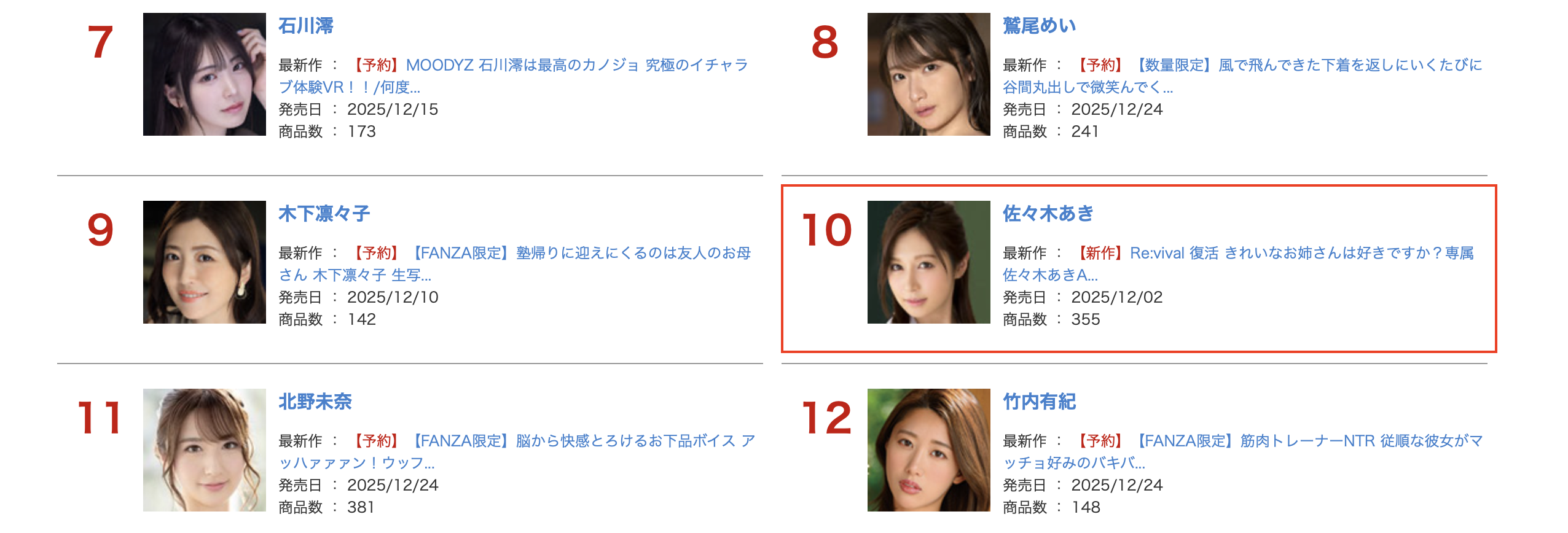 再加上是久違復出,和我一樣興奮者有之、想看看老朋友現在變成什麼樣子的應該也很多,所以佐々木あき(佐佐木明希)這支復活作品的買氣相當旺,在剛剛公佈的fanza實體作品的11月銷售排行榜她拿下第6、累積銷售則是第10,可說是為了M社和自己拿下來好彩頭ー不過我們都知道這一行人氣變化很快,初入江湖天下無敵然後沒過多久寸步難行的例子太多了,佐々木あき(佐佐木明希)第一支作品打了勝仗可不能掉以輕心,因為大家都看過她現在的模樣了,不喜歡的人很有可能不會再買片了,接下來就要看她的真本事惹: