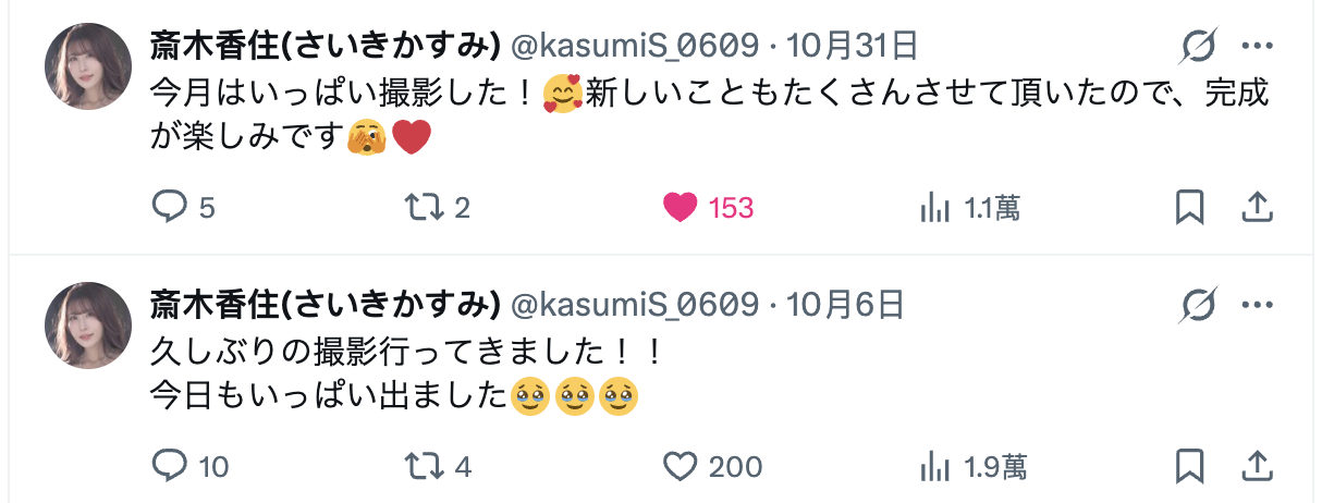 之所以這麼說是因為斎木香住(齋木香住)在X(https://x.com/kasumiS_0609)上更新的消息:她是個蠻有趣的女優,在暫停發片的時候她幾乎沒在更新社群,但她有提到兩件重大訊息,一個是在KANBi的片子發完後她今年不會再有作品了,第二個則是「10月拍了很多作品」: