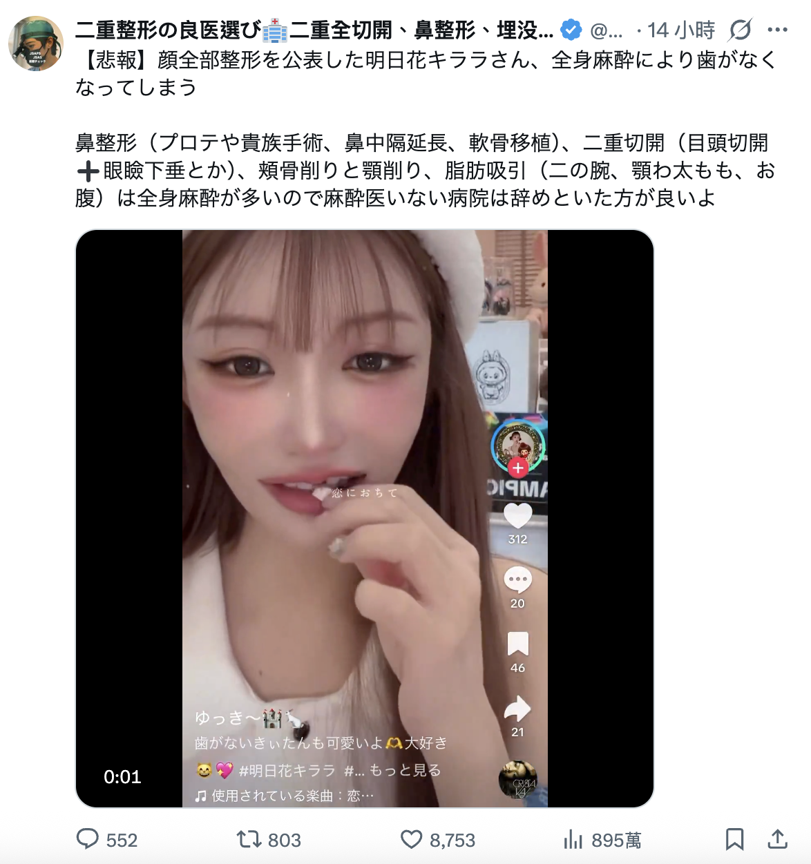 然後馬上就有整型醫生說了(https://x.com/gankenkasui05),明日花キララ(明日花綺羅)的症狀是因為整型時接受全身麻醉的後遺症,這位醫生呼籲,整型時選擇有合格麻醉醫師的診所真的非常重要⋯