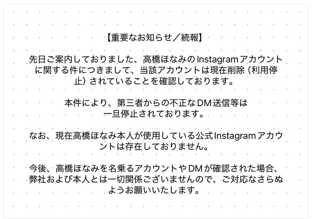 然後過了好一陣子,經紀公司再度發文,說高橋ほなみ(高橋保奈美)的IG帳號已經刪掉了,然後目前本人已經沒有在用任何的IG帳號,所以任何使用高橋ほなみ(高橋保奈美)名義的IG帳號都跟女優及其經紀公司無關,特此聲明。